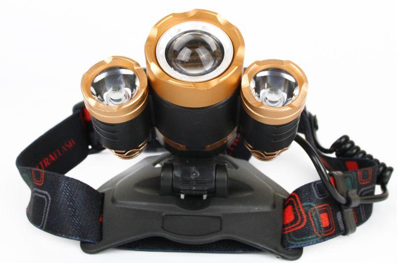 Фонарь Ultraflash электрический светодиодный налобный аккумуляторный. Цвет корпуса: золото / черный. Материал: корпуса фонаря — алюминиевый сплав / пластик. Источники света — светодиод XML-T6 с потребляемой номинальной мощностью 4 Вт, 2 светодиода XPE с потребляемой мощностью 3 Вт. световой поток до 300 люмен. Дистанция освещения — до 250 метров. Регулируемый фокус (ZOOM). 4 режима работы: XML-T6 / 2 боковых LED / все LED BOOST / мигалка. Возможность работы и от одного, и от двух аккумуляторов. Возможность работы напрямую от Powerbank через вход Micro USB. Индикатор заряда, меняющий цвет при окончании заряда. Выключатель: четырехпозиционный кнопочный. Время работы при полностью заряженном аккумуляторе (для емкости 1200 мА-ч):: в режиме XML-T6 — до 3,5 часов, в режиме 2 X XPE — до 5,8 часов, все LED — до 2,3 часов, мигающий режим — до 4 часов. Заряд через вход Micro USB при помощи распространенных зарядных устройств для телефонов с Андроидом. Время заряда (ток заряда 1А, аккумуляторы 1200 мА-ч) — 6 часов. Комплектация: фонарь, бокс для аккумуляторов, 2 X 18650 Li — Ion аккумулятора с напряжением DC 3,7 В емкостью по 800 мА-ч, ремешок, инструкция, упаковка. Степень пыле-влаго-защиты IP20. Упаковка — картонный бокс. Максимальный линейный размер фонаря 10 см. Размер упаковки 11,5 см x 11 см x 10 см. Вес без упаковки и аккумуляторов 0,17 кг. Вес с упаковкой и аккумуляторами 0,310 кг.