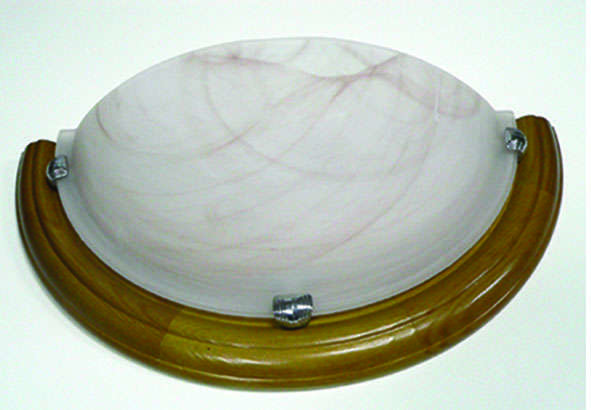 Представляет собой настенный осветительный прибор с полукруглым плафоном из алебастрового стекла, матово-дымчатого цвета, арматура коричневого «дубового» цвета. Возможно крепление на потолке.