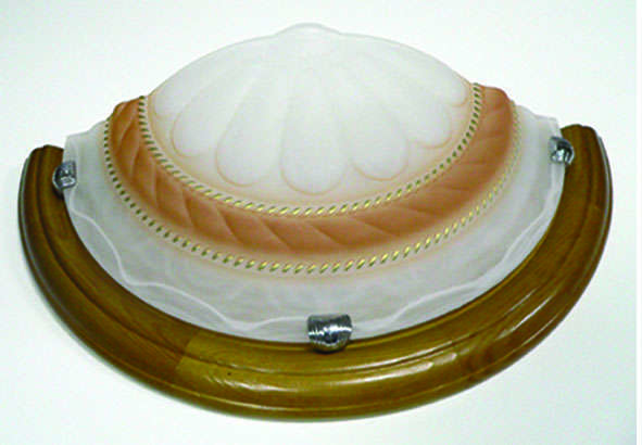 Представляет собой настенный осветительный прибор с полукруглым плафоном в форме ракушки, из алебастрового стекла, матово-голубого цвета, арматура коричневого «дубового» цвета. Возможно крепление на потолке.