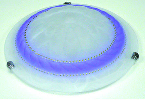 Арматура алюминиевая. Плафон круглый, выпуклый, диаметром 250 мм, из структурированного стекла, белого матового цвета с каймой золотистого и голубого цвета.