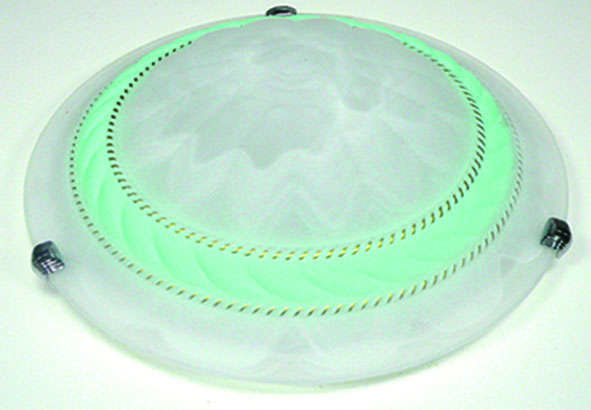 Арматура алюминиевая. Плафон круглый, выпуклый, диаметром 250 мм, из структурированного стекла, белого матового цвета с каймой золотистого и зеленого цвета.