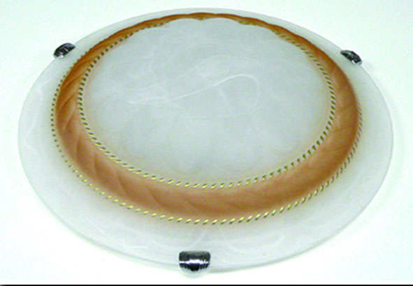 Арматура алюминиевая. Плафон круглый, выпуклый, диаметром 250 мм, из структурированного стекла, белого матового цвета с каймой золотистого и коричневого цвета.