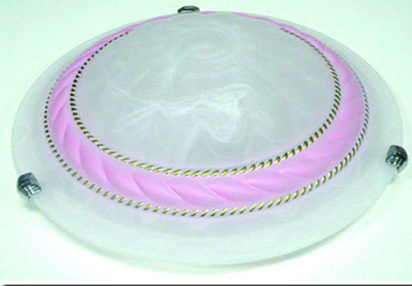 Арматура алюминиевая. Плафон круглый, выпуклый, диаметром 250 мм, из структурированного стекла, белого матового цвета с каймой золотистого и розового цвета. Монтажное отверстие диаметром 65 мм.