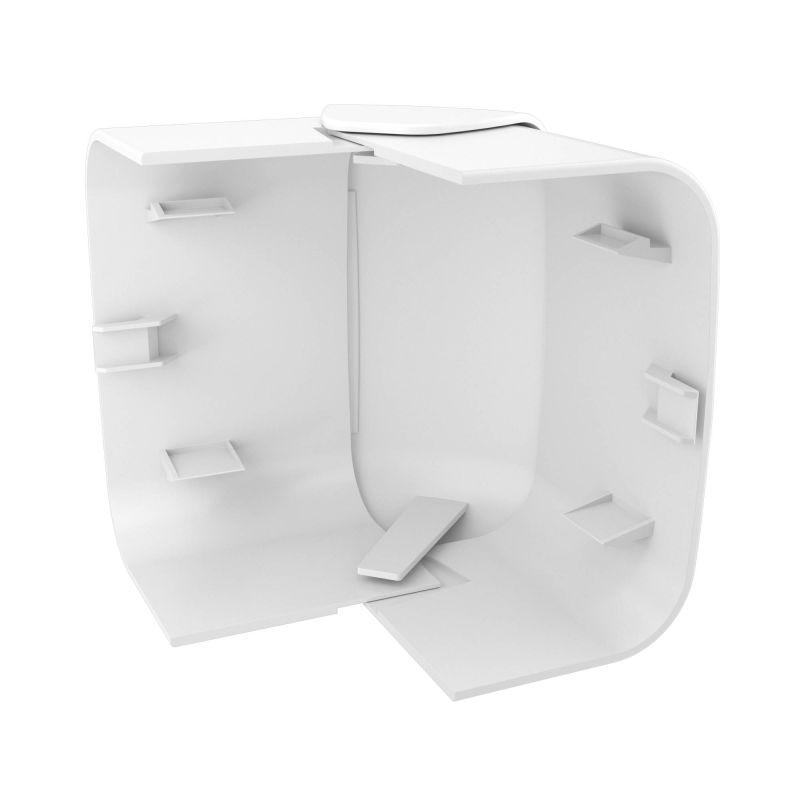 Угол внешний изменяемый (80-120°). Назначение: декоративное оформление мест стыковки кабельных коробов. Характеристики: материал накладки – АБС-пластик; материал базы и разделителей – ПП; встроенные перегородки. Комплект поставки: внешняя декоративная накладка; внутренняя база; разделители (для монтажа на базу). Типоразмер 90х50, 90/2х50. Цвет белый