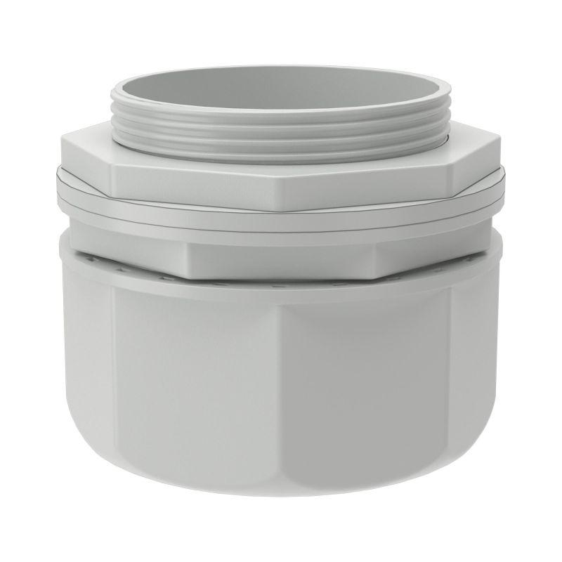 Переходник «Армированная труба — коробка» для герметичного соединения гибких армированных труб с ответвительными коробками, корпусами шкафов и боксов. Диаметр — 50 мм. Материал: полипропилен. Степень пыле- и влагозащиты IP65. Цвет серый RAL 7035. Элемент системы может эксплуатироваться при широком диапазоне температур: от –25°С до +60 °С.