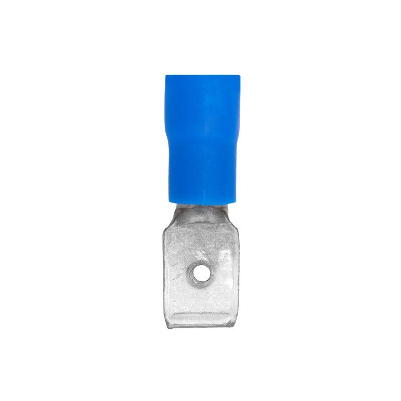 Плоские наконечники быстрого соединения (вилка «папа») предназначены для оконцевания кабеля и проводов с медными жилами сечением от 1.5 до 2,5 мм2 в электрических цепях переменного и постоянного тока, напряжение до 600 В. Материал контактной части – электротехническая медь, материал изоляции — ПВХ. Луженое покрытие обеспечивает защиту от коррозии. Фланец изолирован. Номинальный размер соединителя 6,3?0,8 мм2. Цвет — синий.